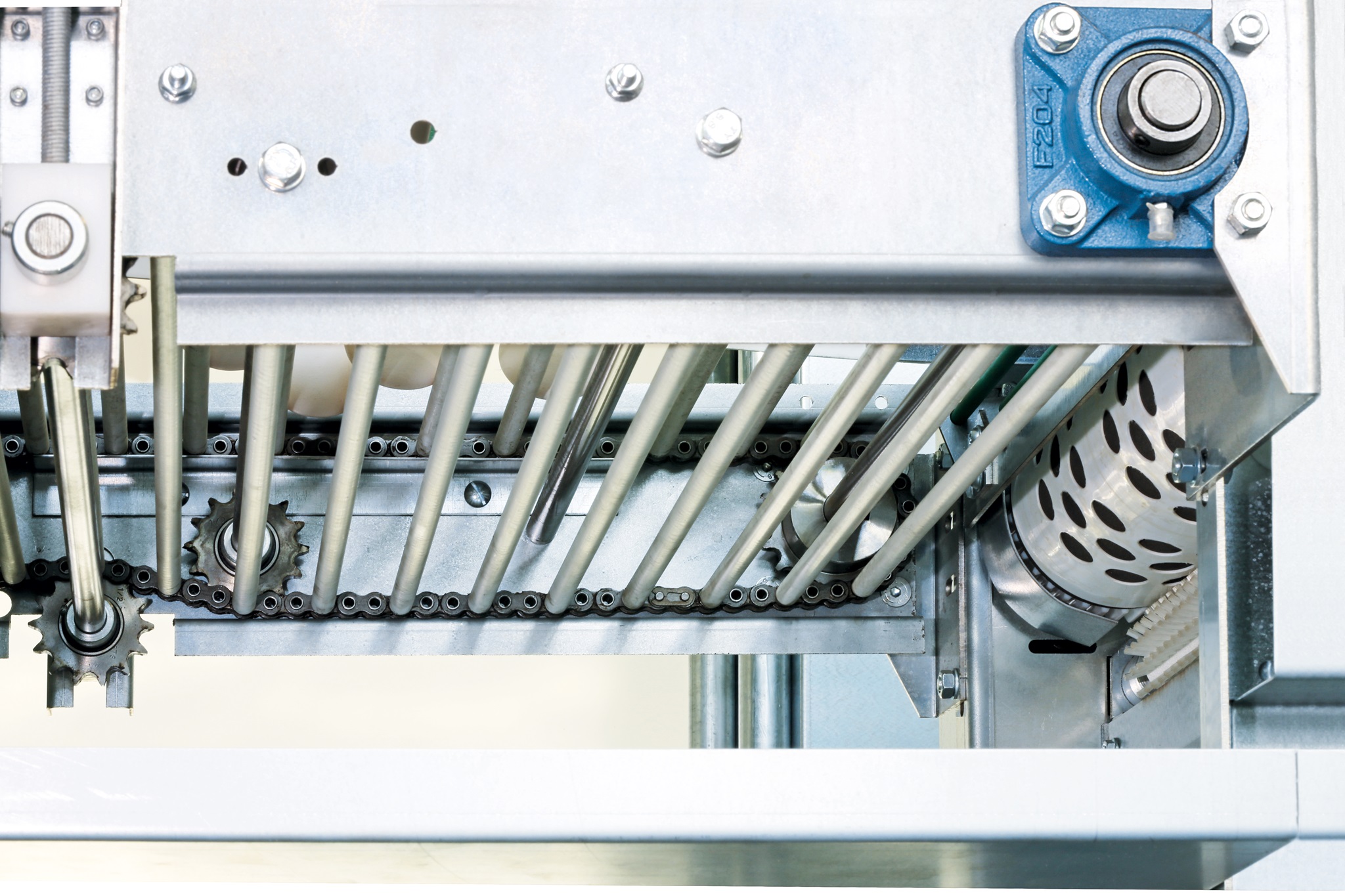 Dazu gehören als wesentliche Produkte spezielle Leiteinheiten für die Eier-Quersammlung und das S-Kurvensystem für den Transport von der Voliere zum Querförderband.