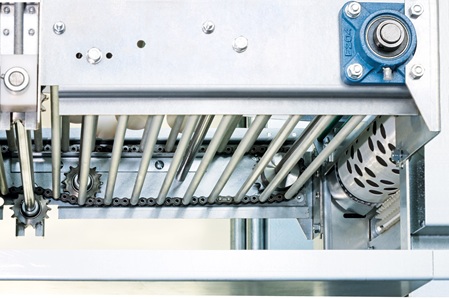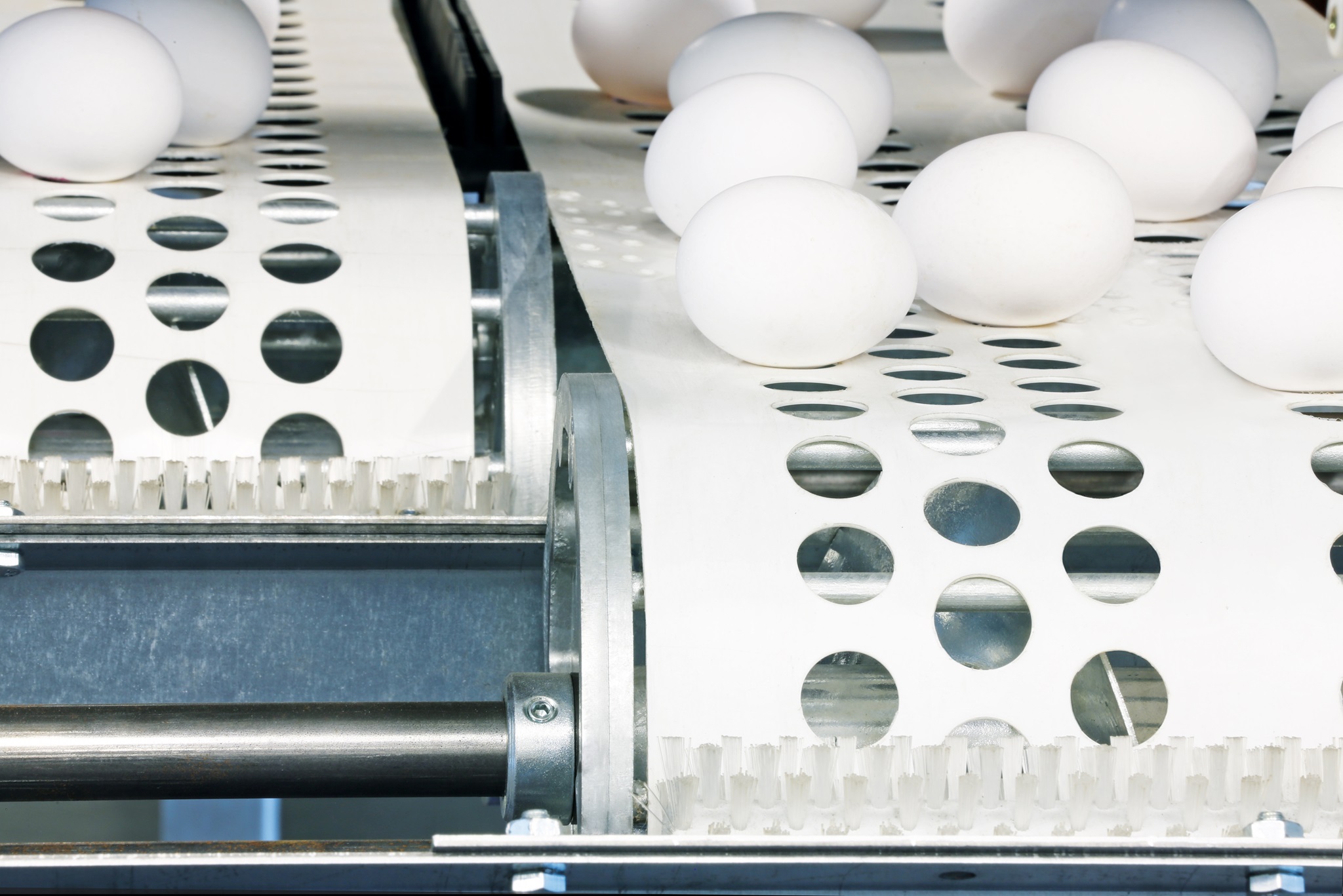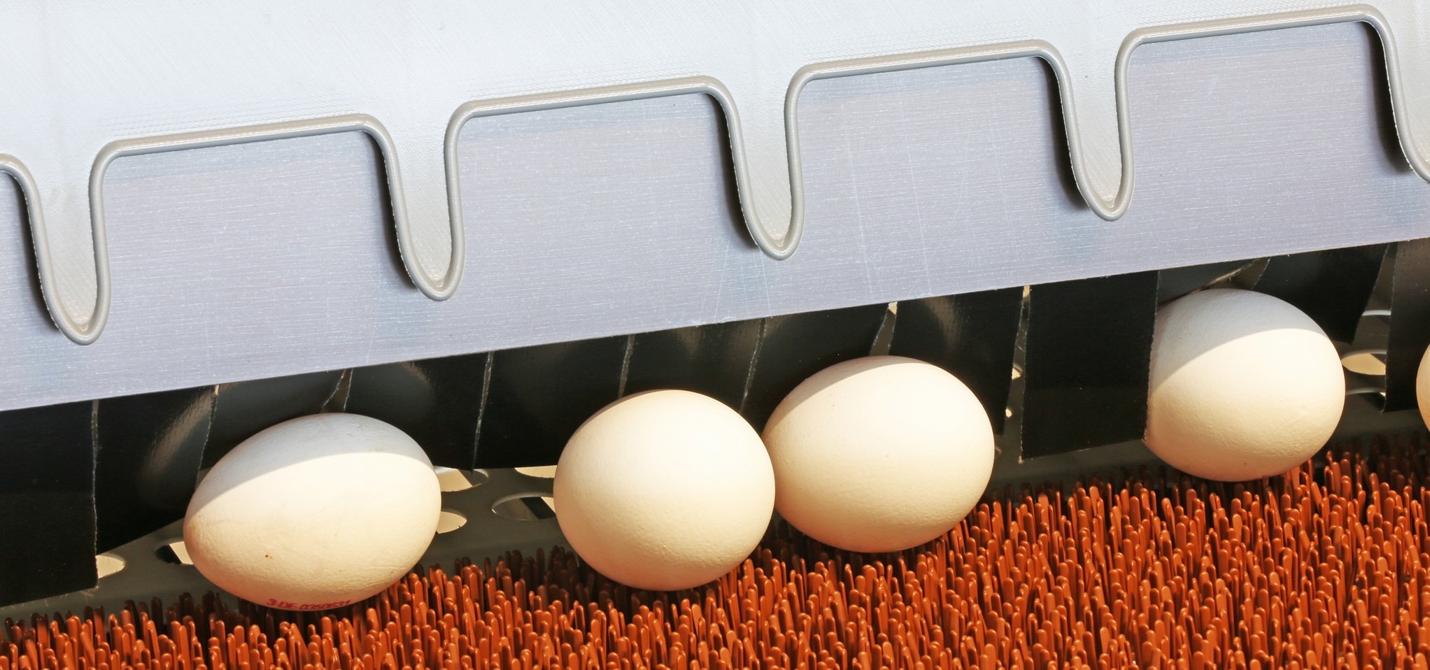 Die Eier werden auf der Leiteinheit für die Quersammlung zwar berührungsfrei, aber doch eng zueinander positioniert. Das Förderband muss daher nahezu schwingungs- und ruckelfrei laufen – und das auf Längen von bis zu 150 m.